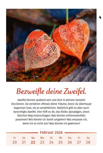 Aufbauend, stärkend, positiv: Der Lebensfreude-Kalender ist ein Original und erscheint zum zweiten Mal im größeren Ausgabeformat von 23,2 x 34,4 cm! Mit größerer Schrift und größeren Fotomotiven. Die motivierenden Ratschlägen, einfühlsamen Lebensweisheiten und stärkenden Achtsamkeitsübungen auf jedem Kalenderblatt lenken den Blick auf das, was im Leben wichtig und schön ist. Das Besondere: Damit die Leserinnen und Leser aus den gewohnten Mustern rauskommen und neue Anregung erfahren, ist das Kalendarium in einem 10-Tagesrhythmus gegliedert. Das macht den Kalender zu einem hilfreichen Begleiter und zu einer Quelle der Inspiration!