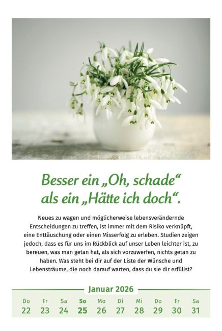Der Original-Wandkalender, der meistgekaufte deutschsprachiger Kalender, 40 Blatt mit Spiralbindung. Mit motivierenden Denkanstößen, psychologischen Impulstexten und Naturfotos